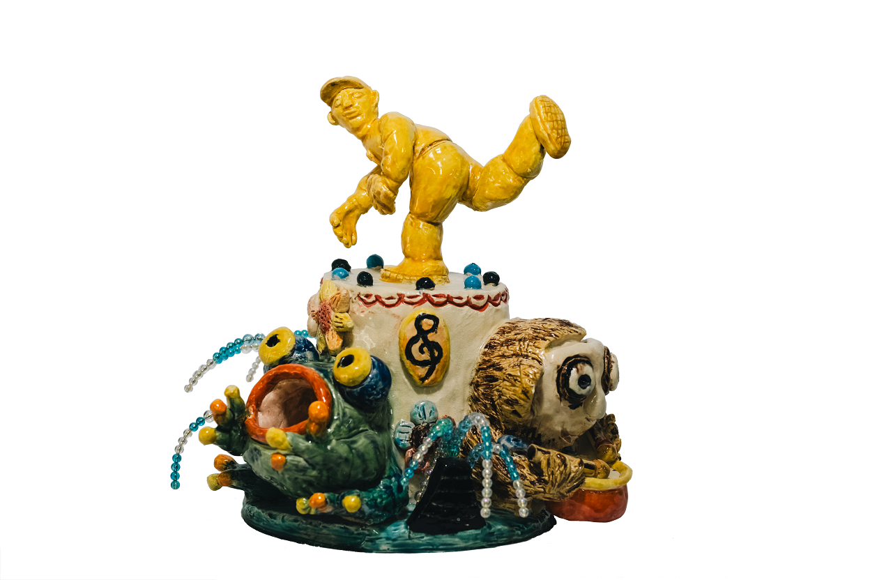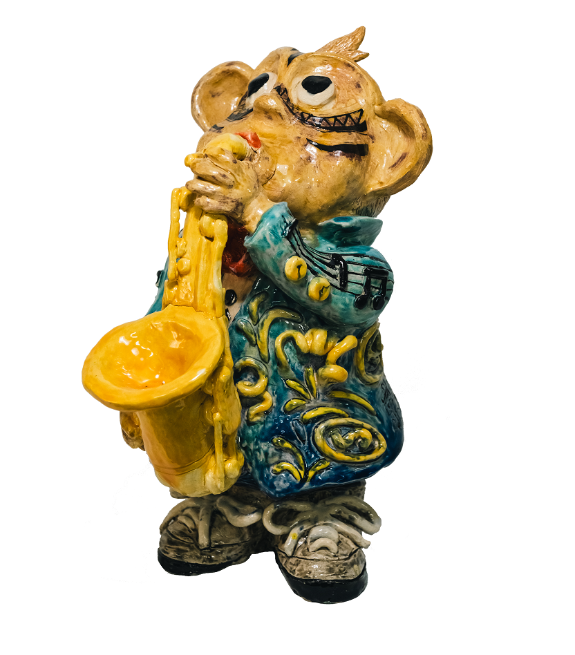 作品理念:嘉義市管樂之都,到處都可以看到石猴最奏樂器。我住的大溪厝社區也有一隻,每次回家出門都會看到,我覺得很有趣,所以我想做一隻吹奏樂器的交趾陶猴子。