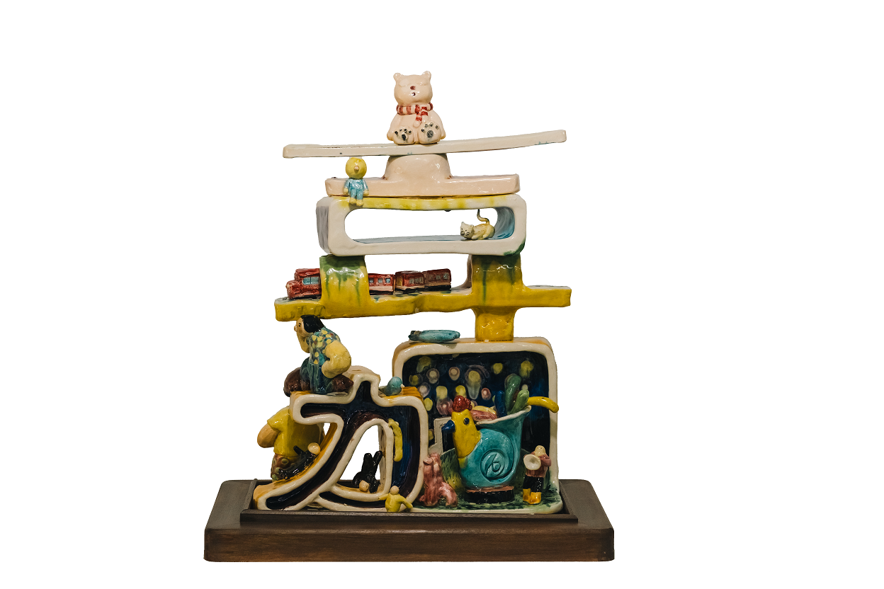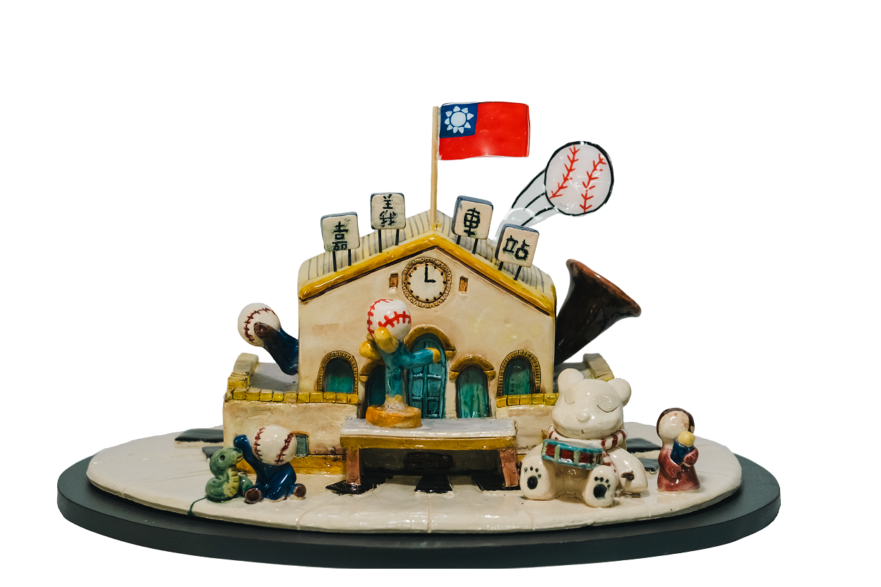 作品理念:以加嘉為核心象徵嘉義的城市精神,官川整體形成作品的靈魂與支撐,層層堆疊的元素,乘載著嘉義的多元文化與生活特色;從人民記憶的火車與棒球、管樂,到小動物與日常風景,都是嘉義人們的共同驕傲。我在家自上方融入了嘉義經典的意象,巧妙結合交趾陶的傳統技法與「笨番扛厝角」的造型,傳達兼任團結的精神,同時也致敬這片土地深厚的工藝文化。作品背面標註「建城321年」不僅紀念嘉義悠久的城市歷史,更象徵這座城市持續茁壯,延續著屬於「嘉」的驕傲與溫度。整片作品如同一座小型嘉義縮影,邀請觀者感受這座城市的故事與活力。
