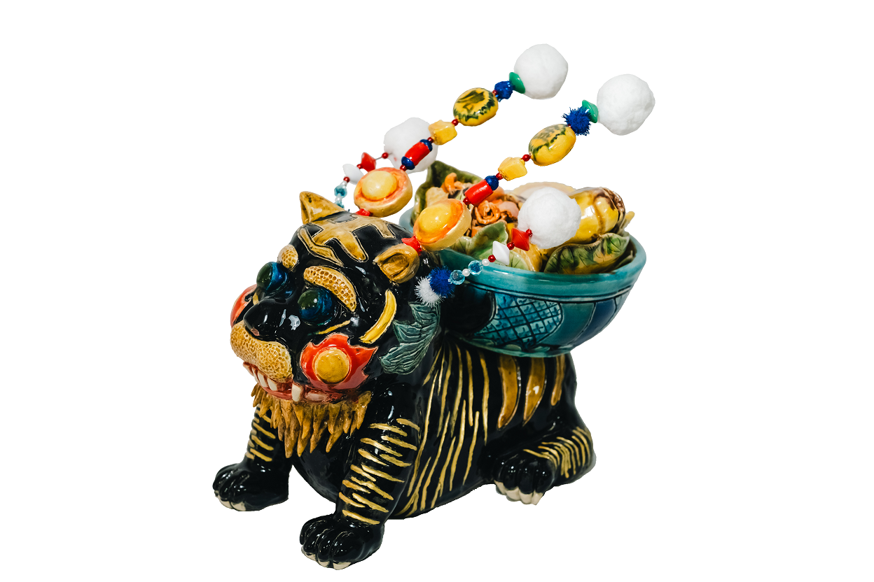 作品理念:我的作品是虎爺,希望他能守護嘉義,因為今年是嘉義建城320 1,我想把祝福放進作品裡,所以虎爺背上了嘉義有名的砂鍋魚頭,是嘉義的特色美食,也代表團聚在一起,幸福又熱鬧。我希望這件作品能讓人看到嘉義的傳統、信仰和在地文化,也把保護城市、分享幸福的心意傳遞給大家。