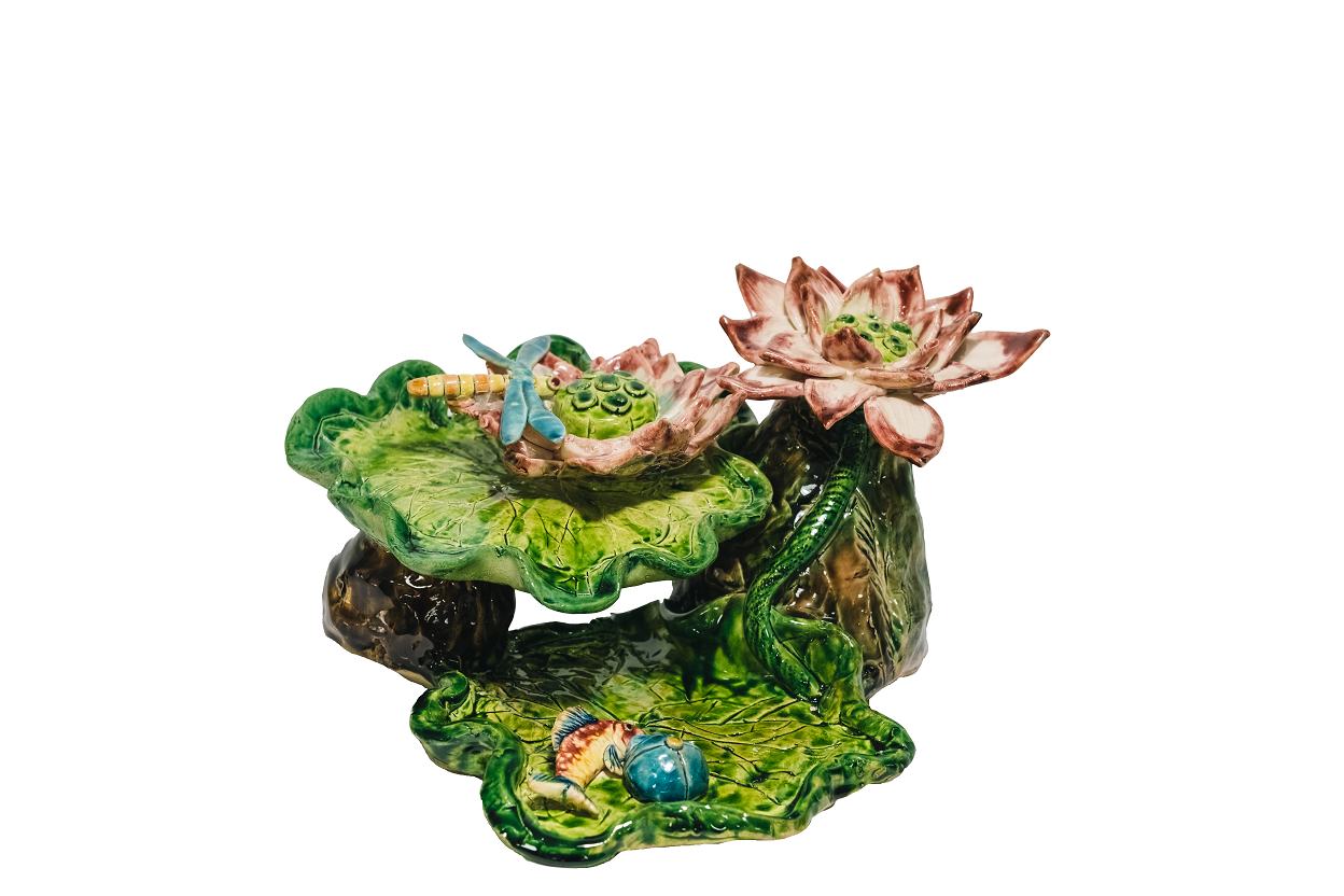 作品理念:以翠綠葉脈與暗灰石頭圍成水池,襯托荷花之美。