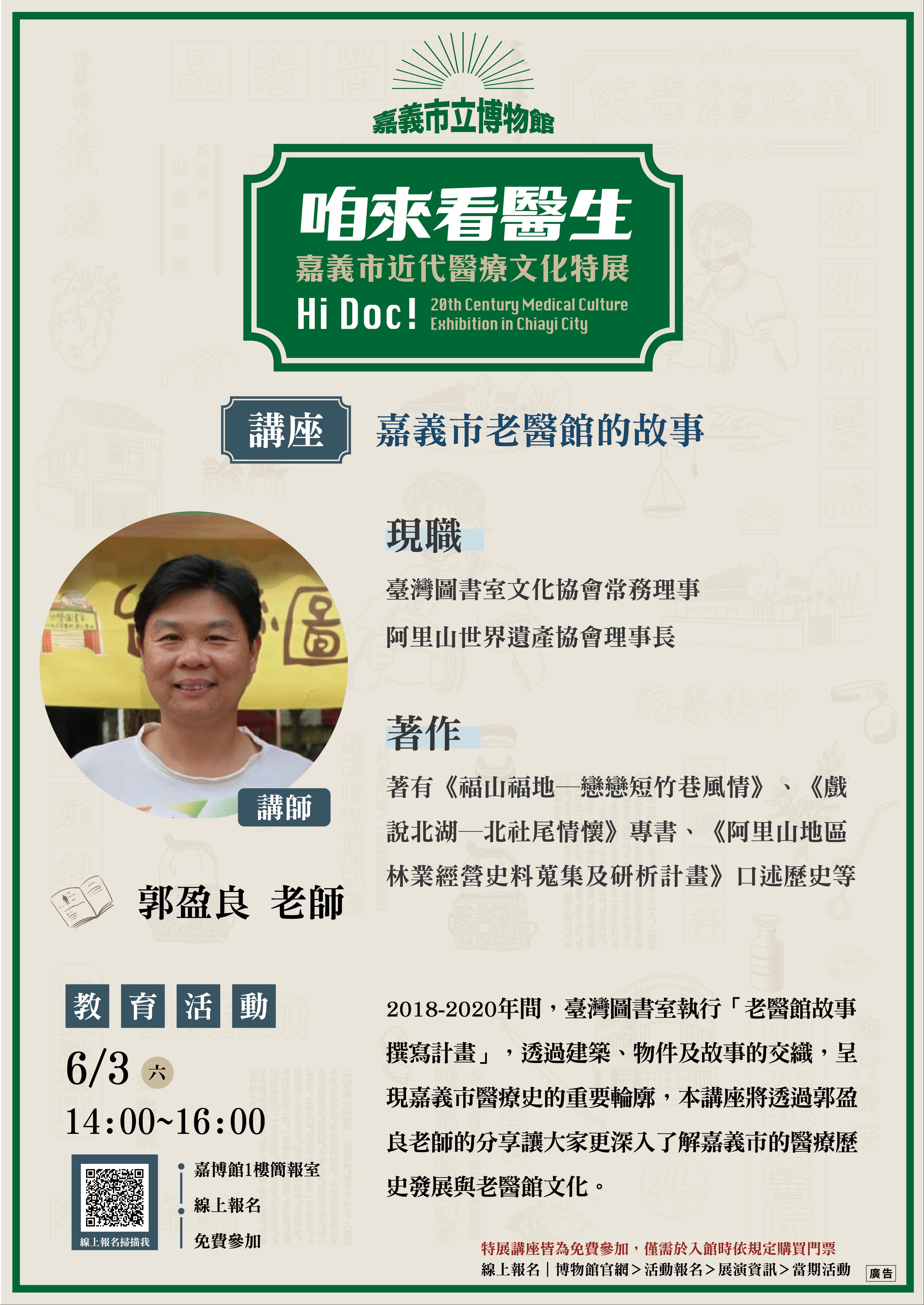 2018-2020年間,臺灣圖書室執行「老醫館故事撰寫計畫」,透過建築、物件及故事的交織,呈現嘉義市醫療史的重要輪廓,本講座將透過郭盈良老師的分享讓大家更深入了解嘉義市的醫療歷史發展與老醫館文化。