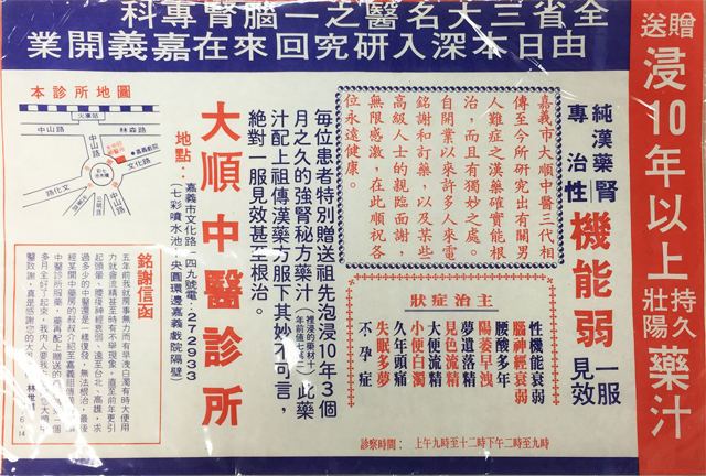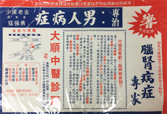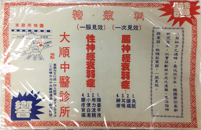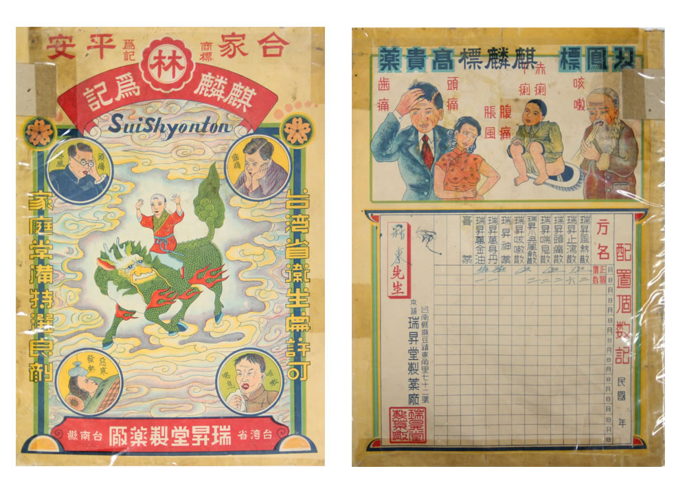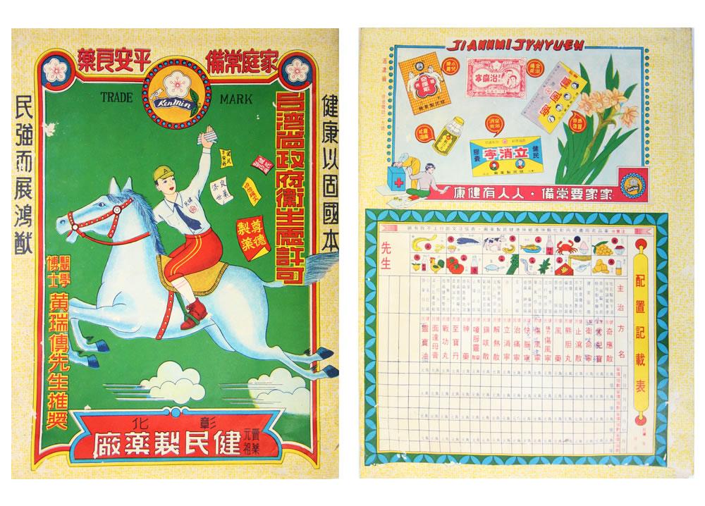 In early times of Taiwan, the medical environment was inconvenient and it resulted in the home delivery service for drug in the towns. In Chiayi City, it included Chang Zhu lane, Chu Kou, Chu Qi, Huo Tan Pu, Niu Chou Pu, Fan Road, etc. At the time, education was not prevailing and most of the people were illiterates. Thus, some drugs were indicated by drawing. It is interesting.